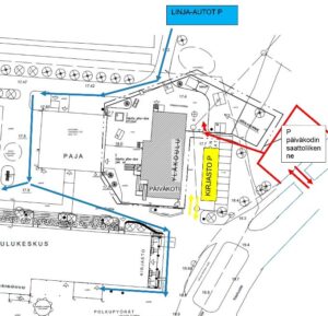 Toivomme, että päiväkodin saattoliikenne jättää autonsa ”yläparkkipaikalle” ja kulkee sieltä jalan pienen matkan päiväkodin aidan vierestä sisääntulo portille.
